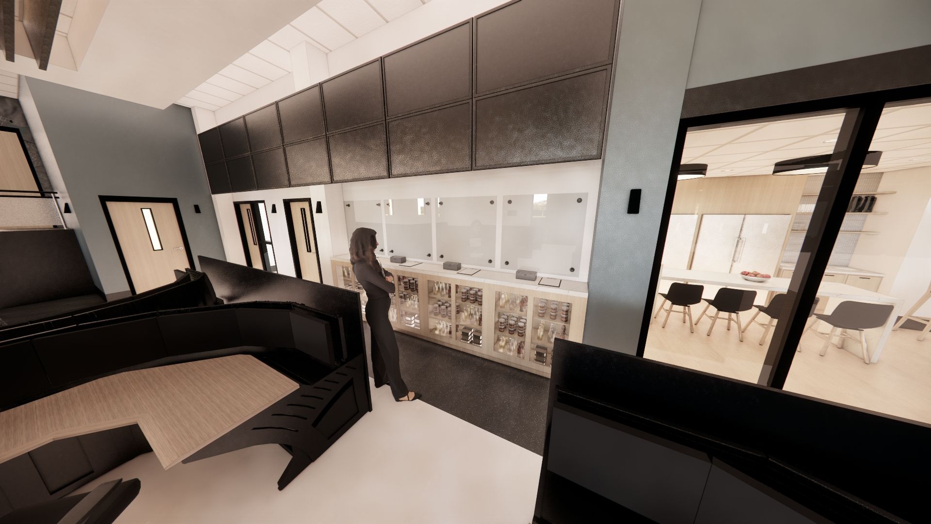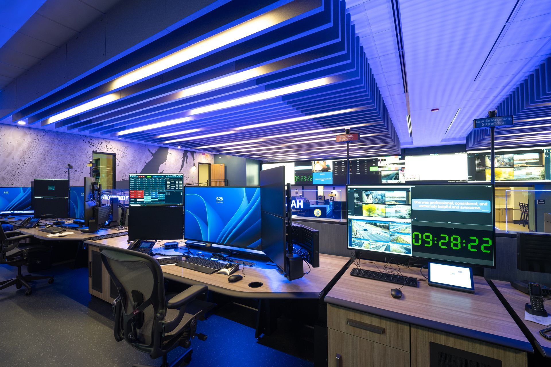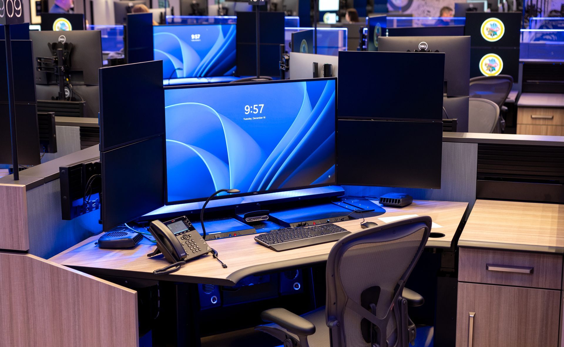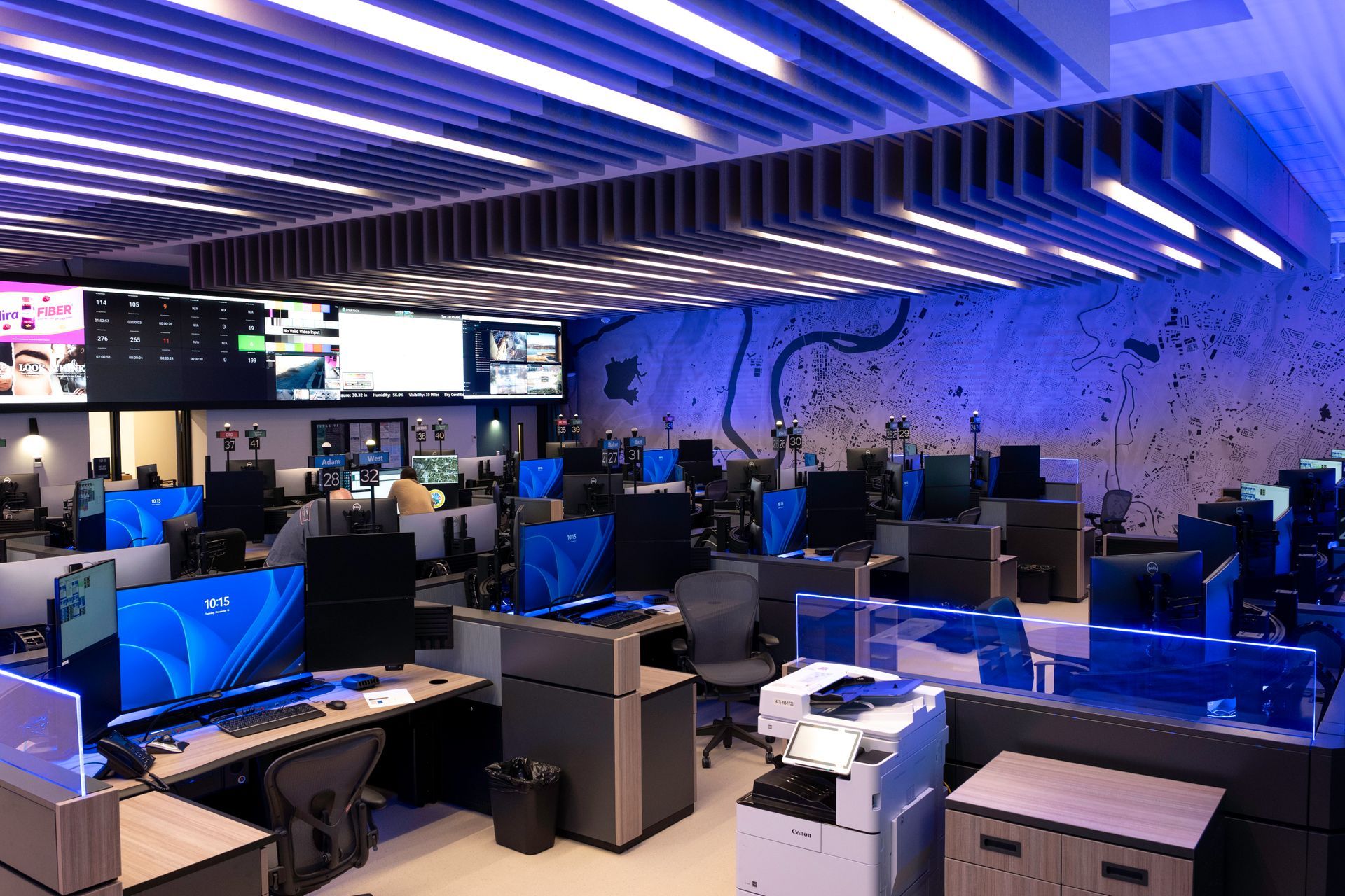 Modern office interior with blue lighting and workstations. Wooden cabinets line the floor.