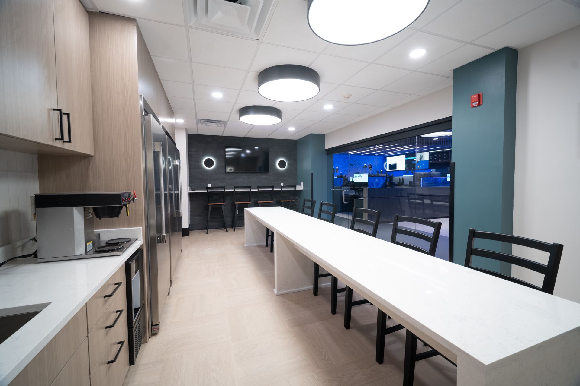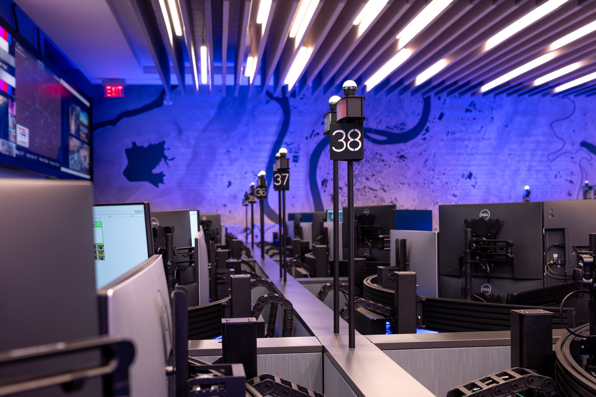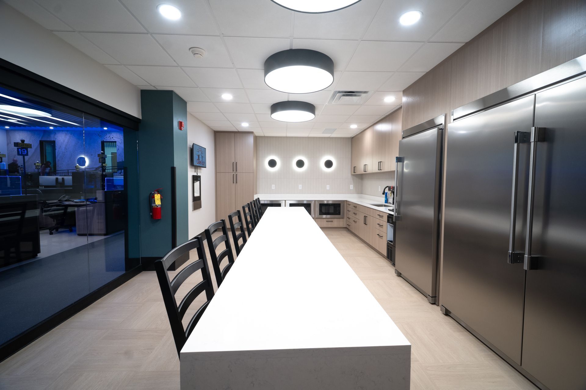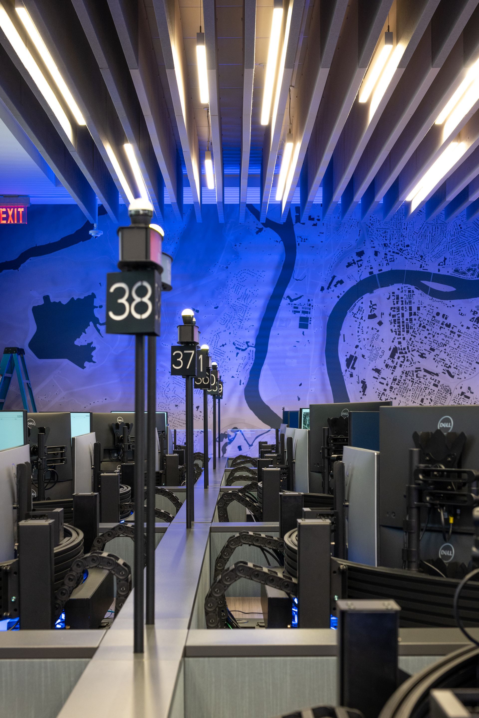 Modern office interior with blue lighting and workstations. Wooden cabinets line the floor.