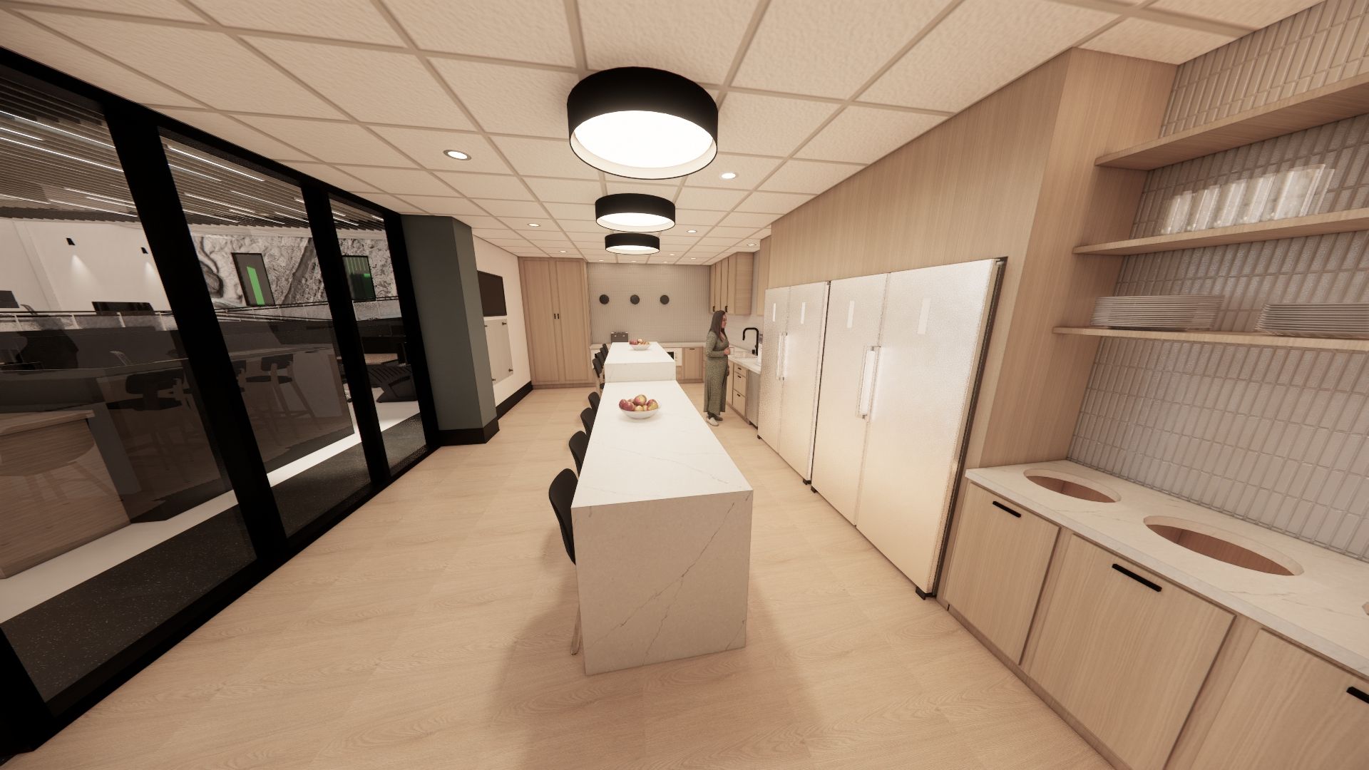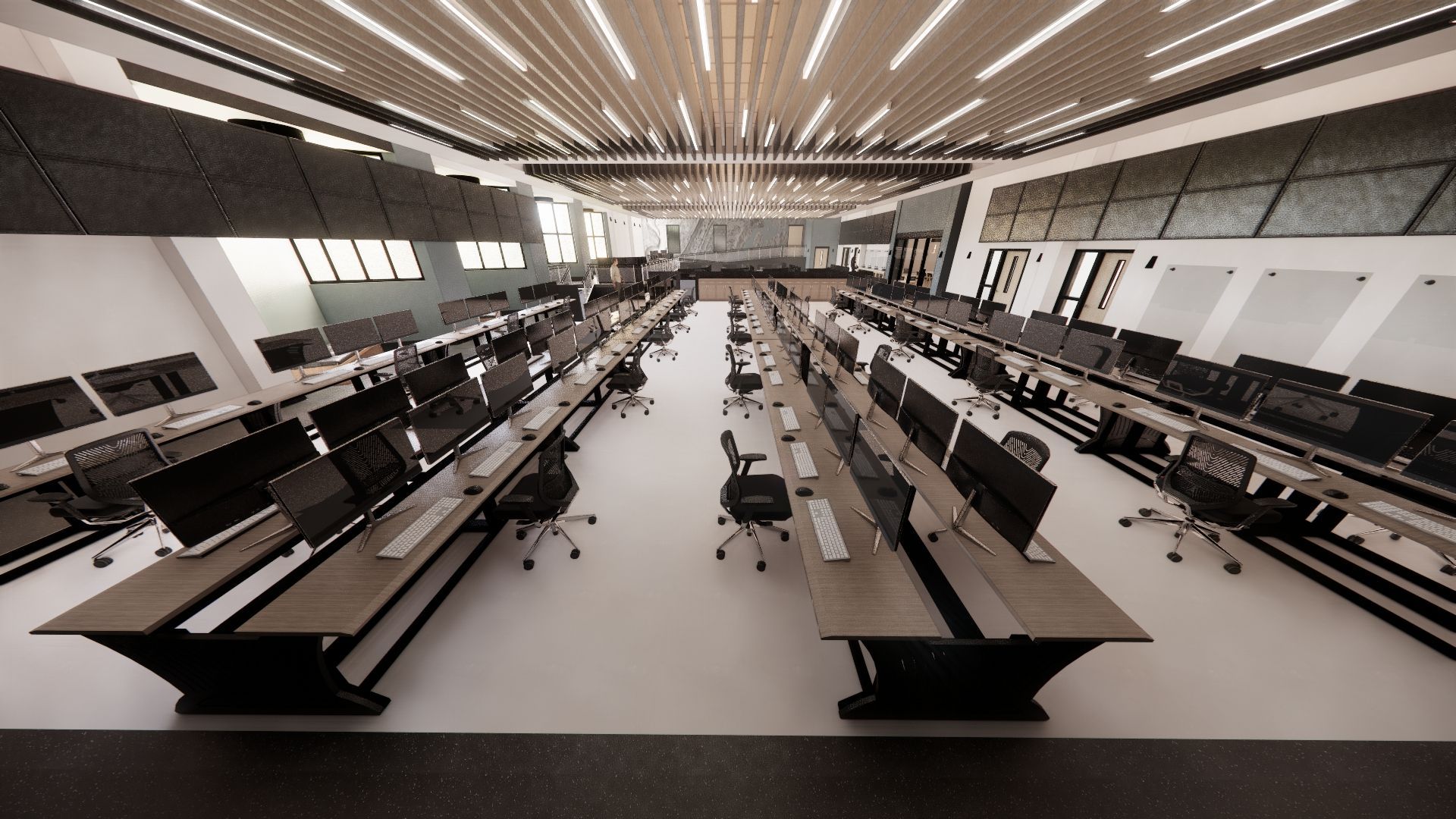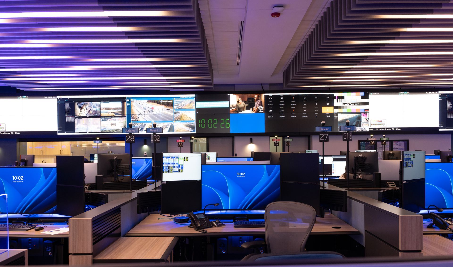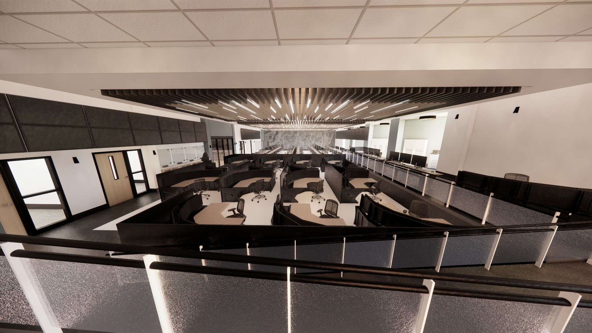 Modern office interior with blue lighting and workstations. Wooden cabinets line the floor.