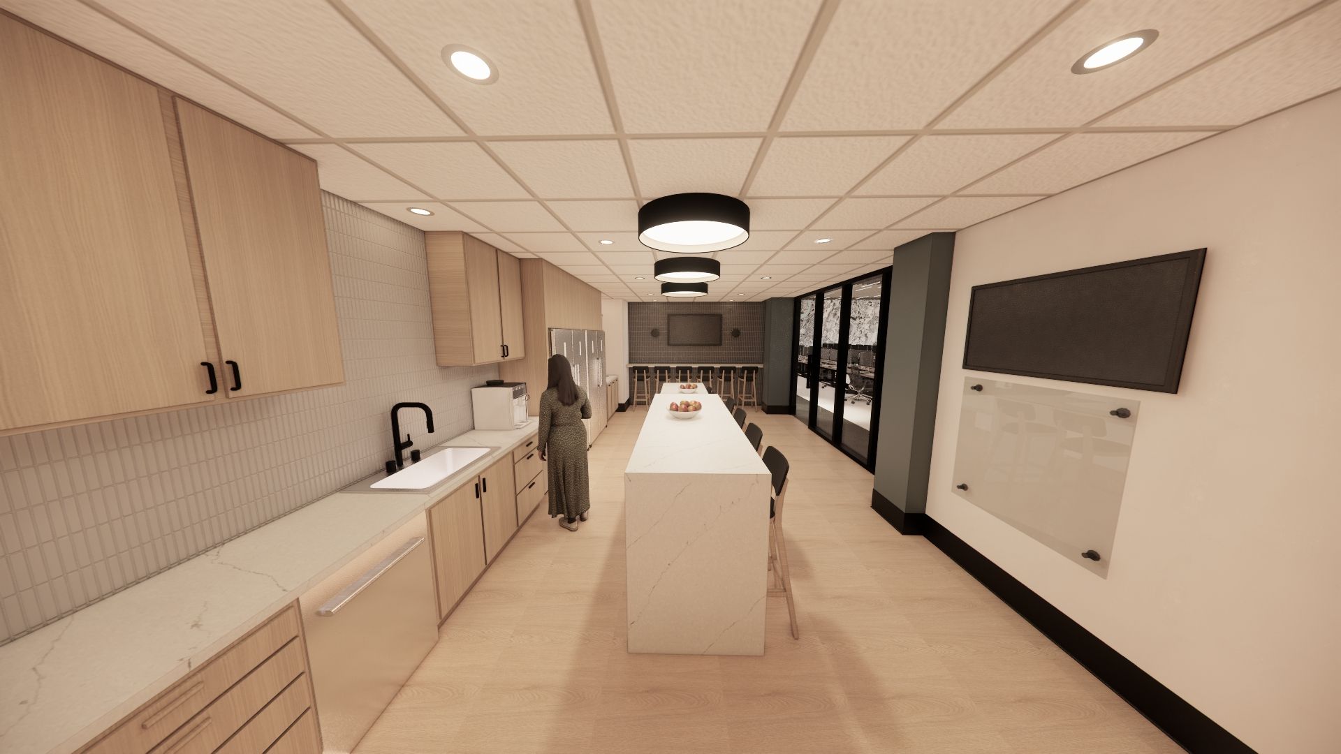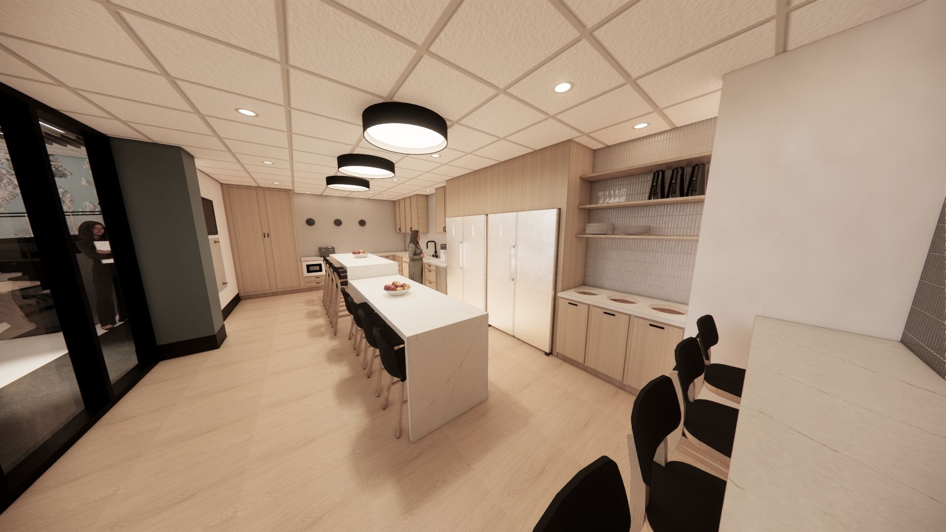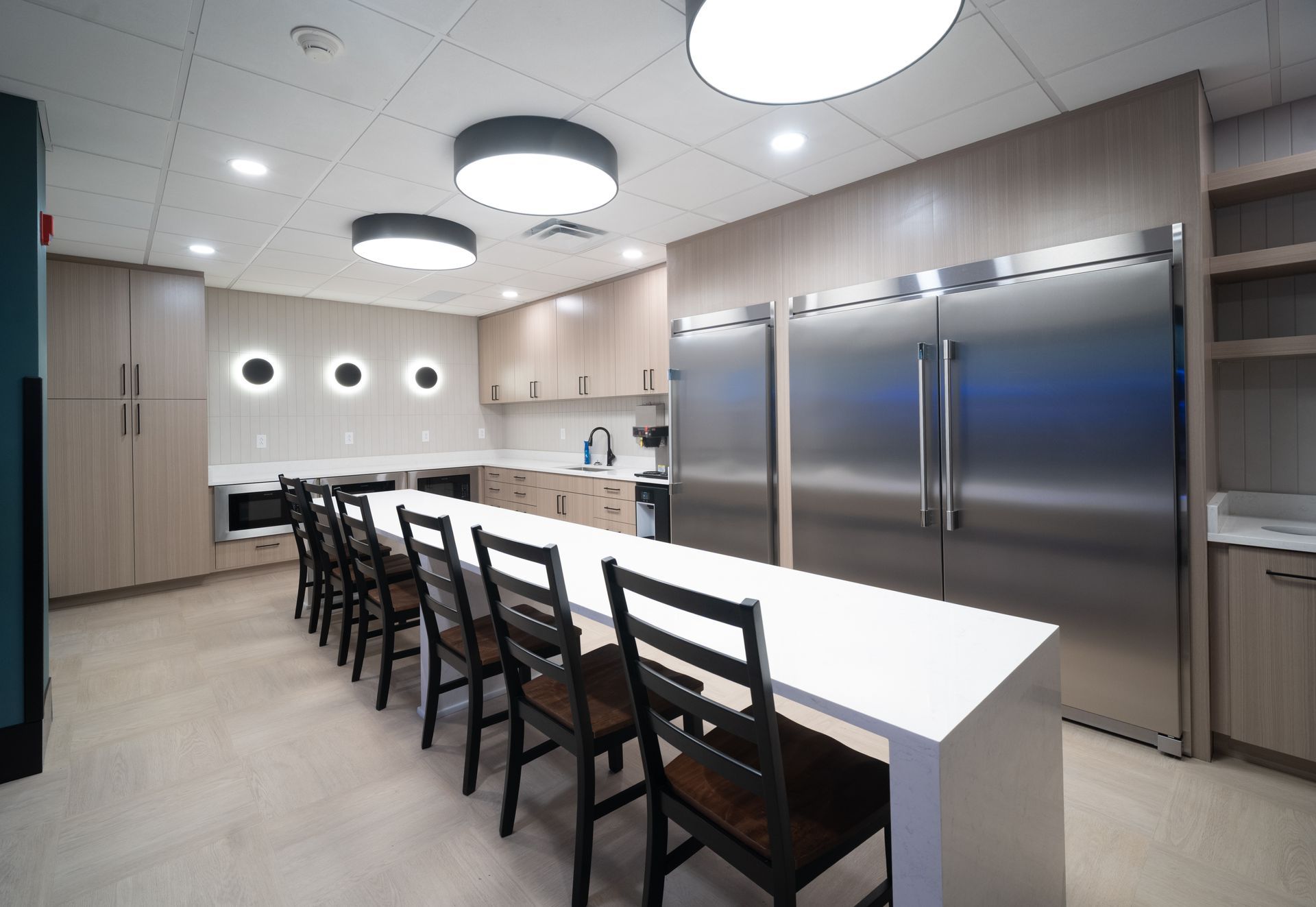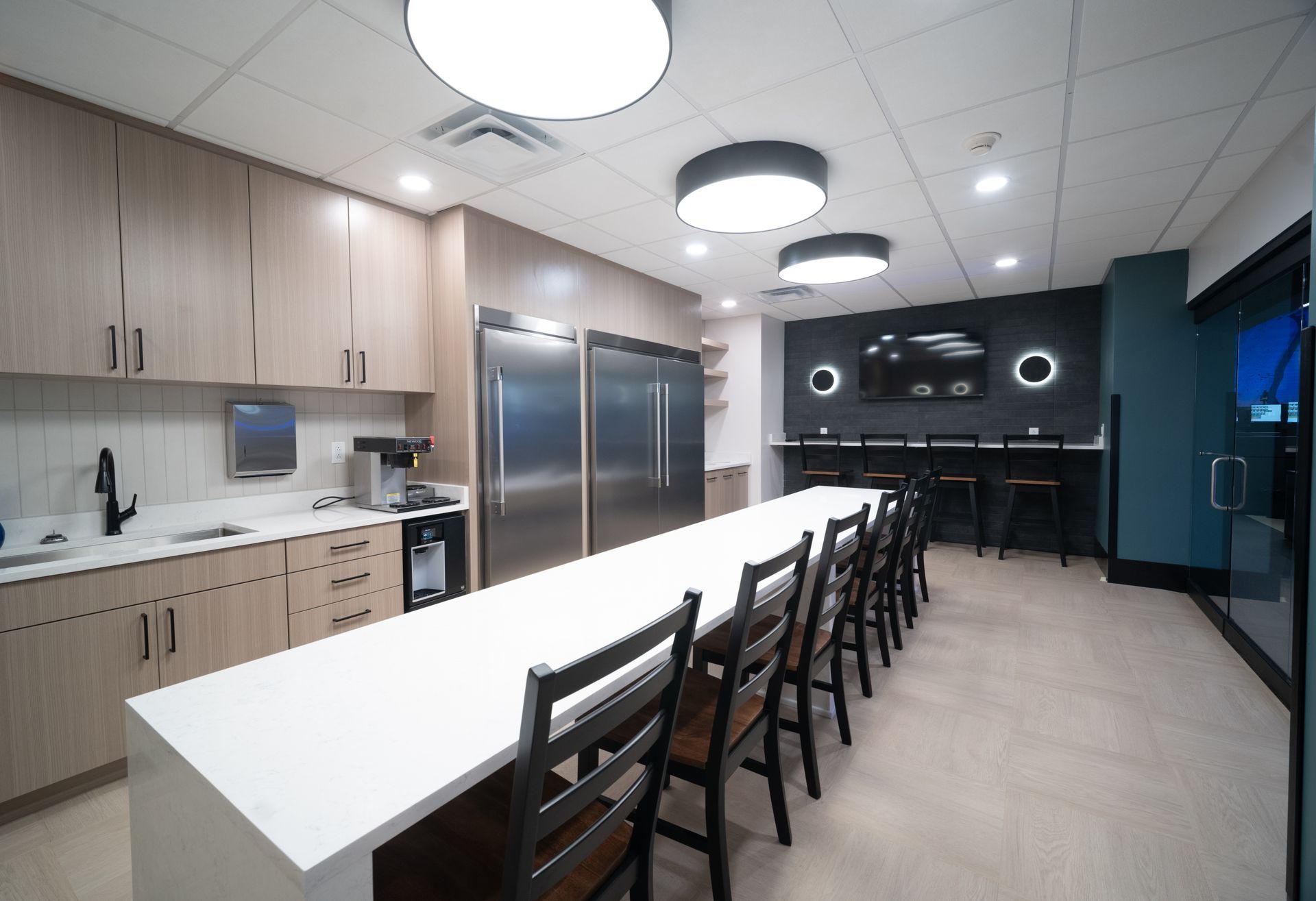 Modern office interior with blue lighting and workstations. Wooden cabinets line the floor.